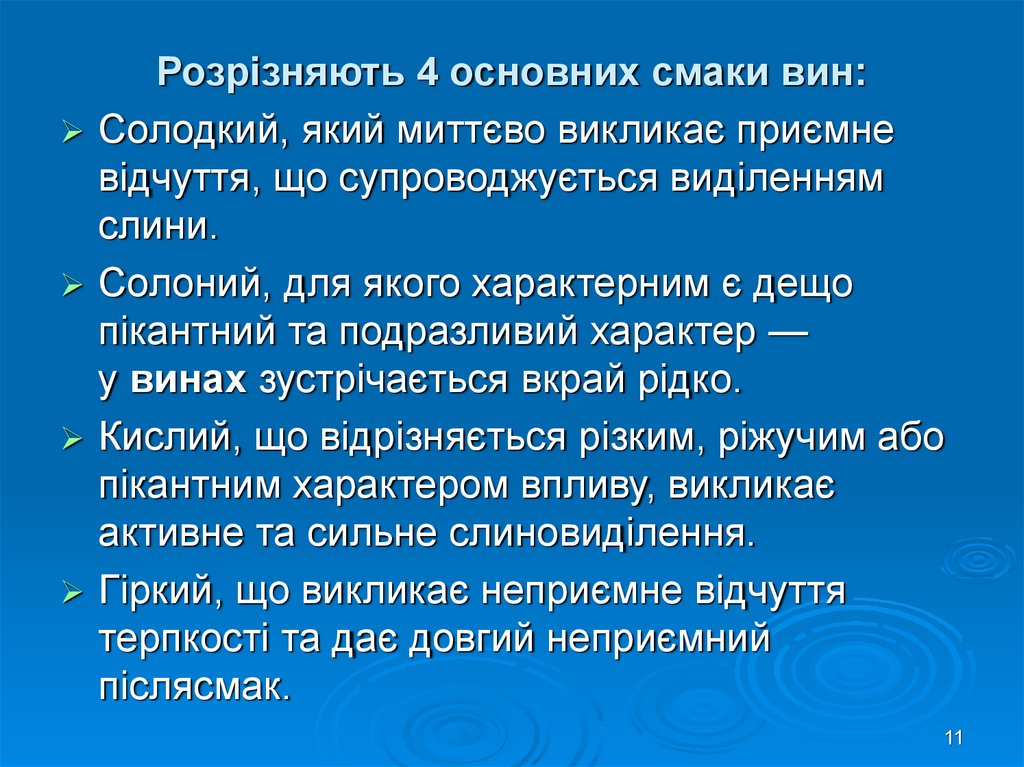 Розрізняють 4 основних смаки вин:Солодкий, який миттєво викликає приємне
