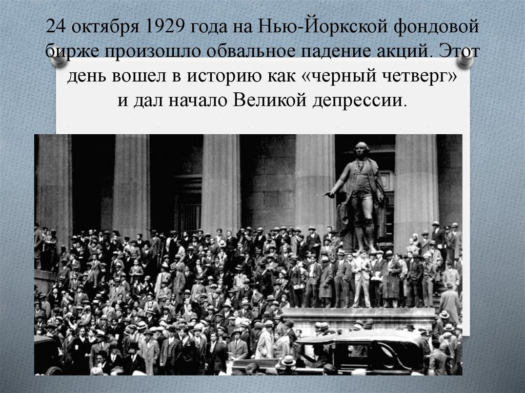 24 октября 1929 года на Нью-Йоркской фондовойбирже произошло обвальное падение акций. Этот