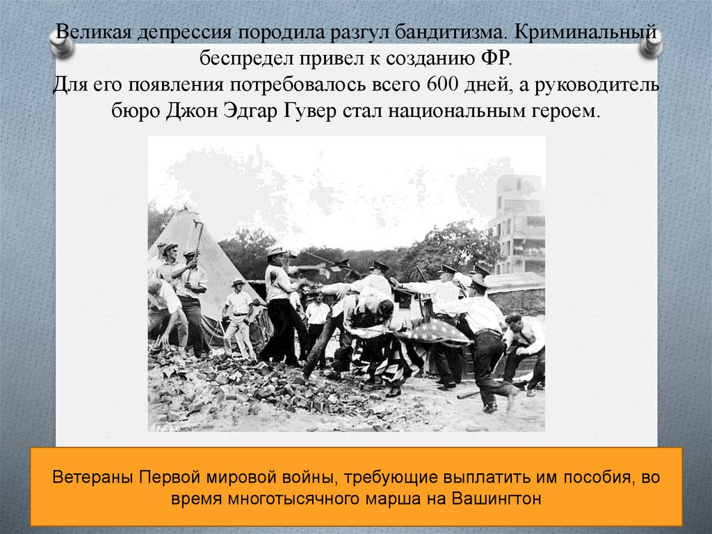Великая депрессия породила разгул бандитизма. Криминальныйбеспредел привел к созданию ФР.