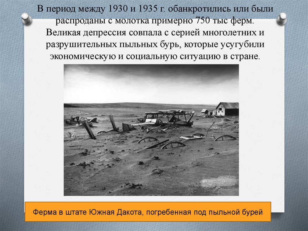 В период между 1930 и 1935 г. обанкротились или былираспроданы с молотка примерно 750 тыс ферм.