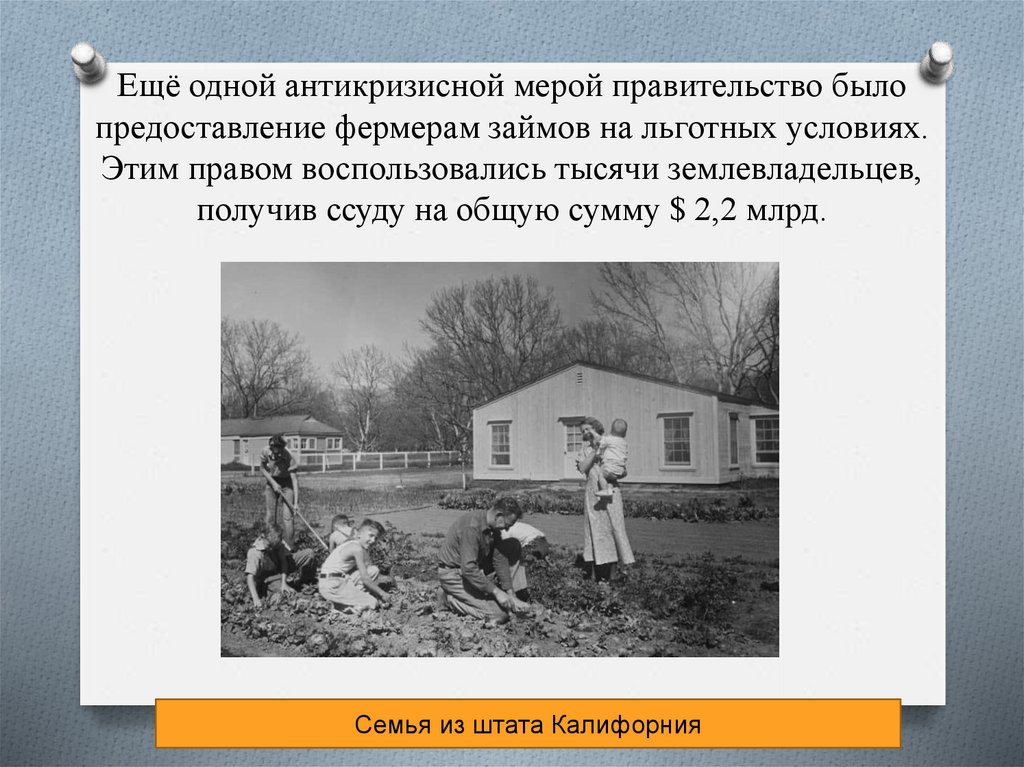 Ещё одной антикризисной мерой правительство былопредоставление фермерам займов на льготных условиях.