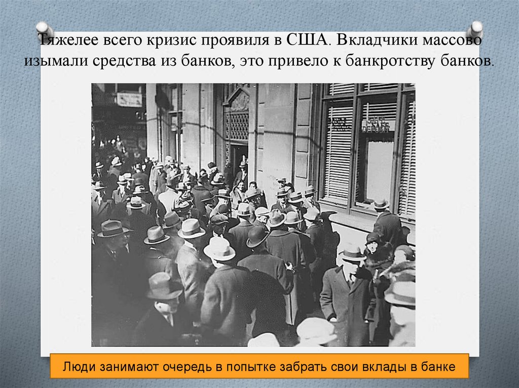 Тяжелее всего кризис проявиля в США. Вкладчики массовоизымали средства из банков, это привело к банкротству банков.