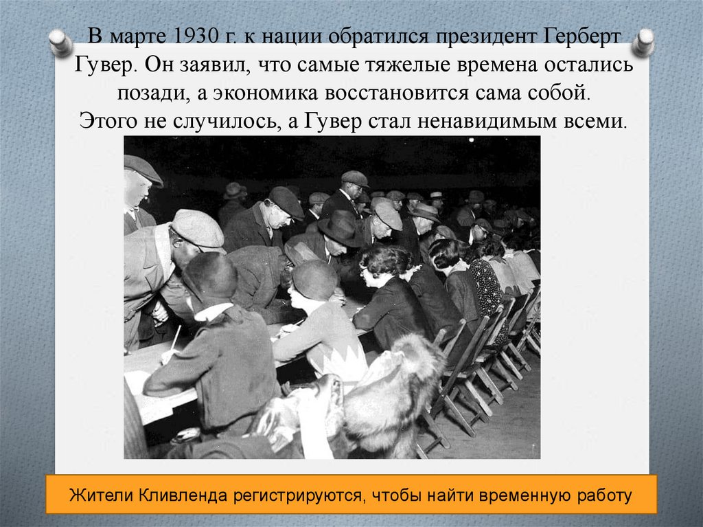 В марте 1930 г. к нации обратился президент ГербертГувер. Он заявил, что самые тяжелые времена остались