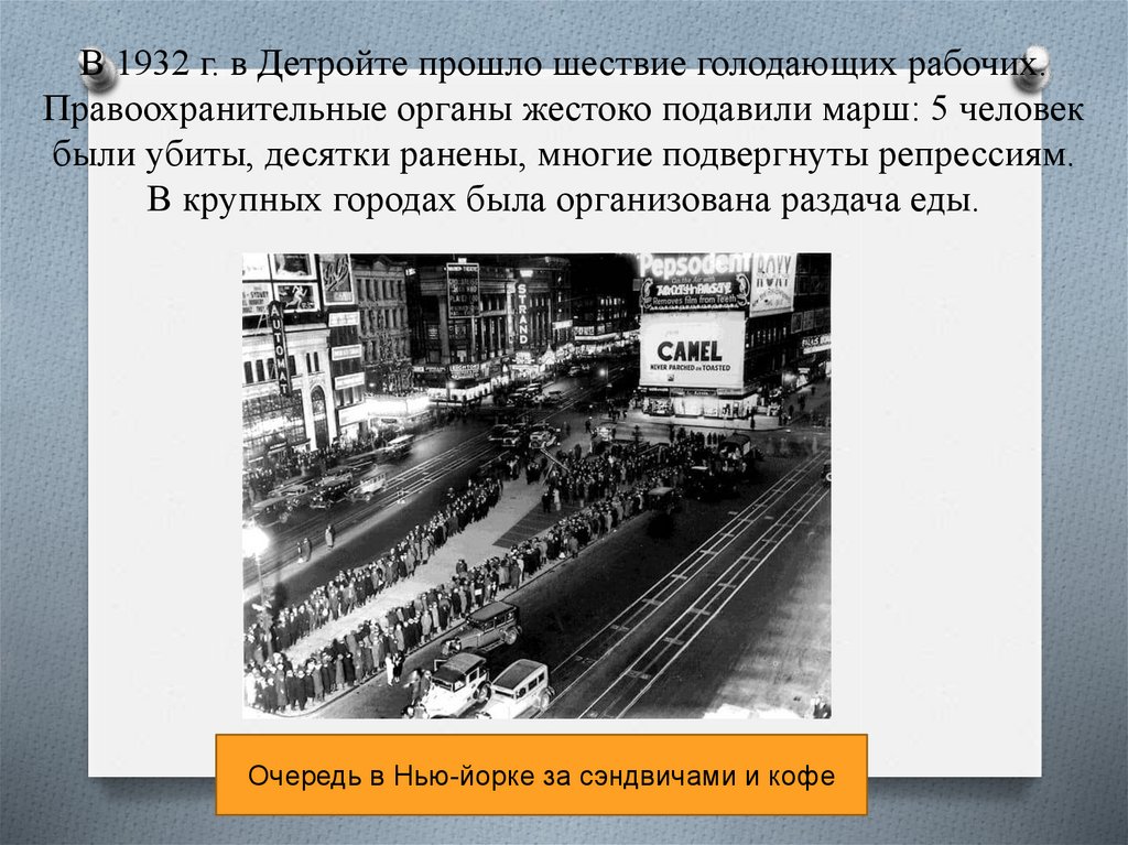 В 1932 г. в Детройте прошло шествие голодающих рабочих.Правоохранительные органы жестоко подавили марш: 5 человек