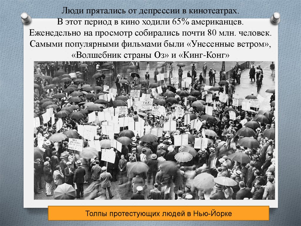 Люди прятались от депрессии в кинотеатрах.В этот период в кино ходили 65% американцев.
