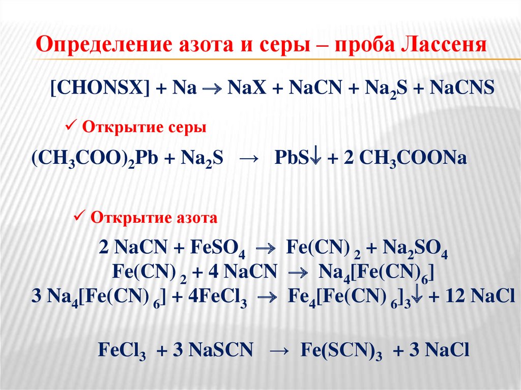 Определение азота и серы – проба Лассеня[CHONSX] + Na NaX + NaCN + Na2S + NaCNS