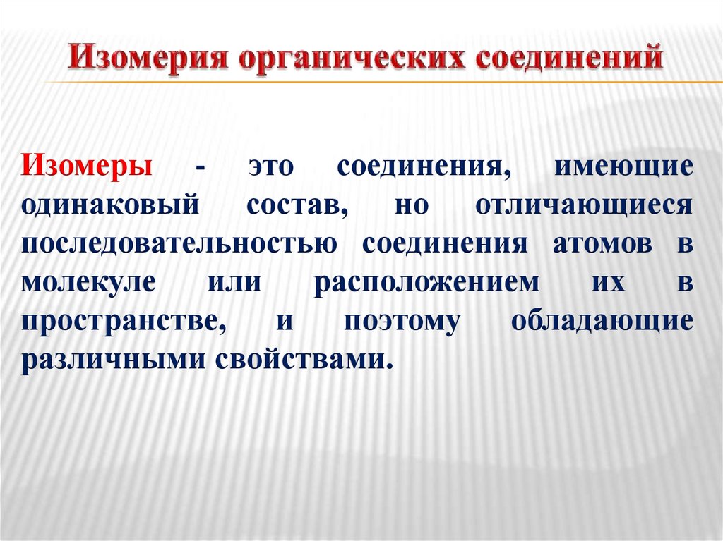 Изомеры - это соединения, имеющиеодинаковый состав, но отличающиеся