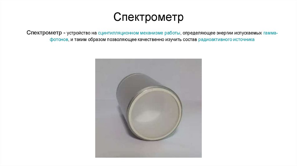 СпектрометрСпектрометр - устройство на сцинтилляционном механизме работы, определяющее энергии испускаемых гаммафотонов, и таким образом позволяющее качественно изучить состав радиоактивного источника