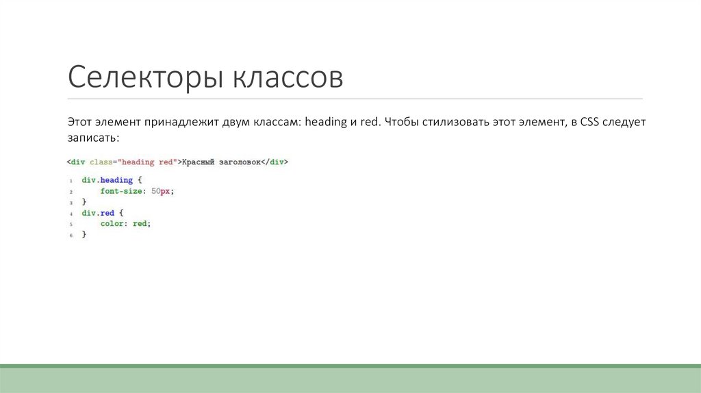 Селекторы классовЭтот элемент принадлежит двум классам: heading и red. Чтобы стилизовать этот элемент, в CSS следует
