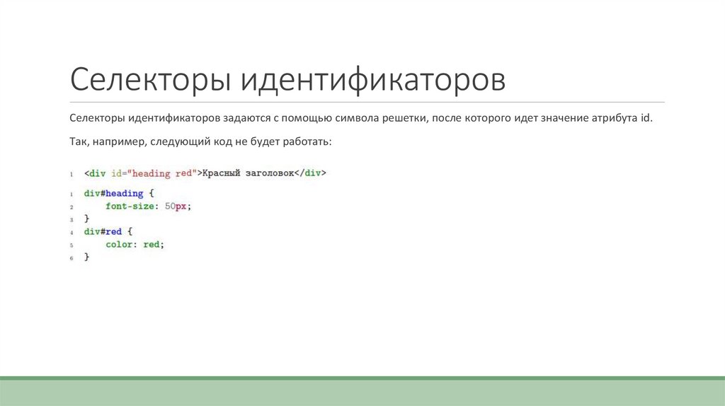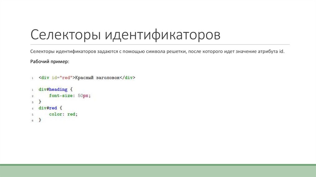 Селекторы идентификаторовСелекторы идентификаторов задаются с помощью символа решетки, после которого идет значение атрибута id.