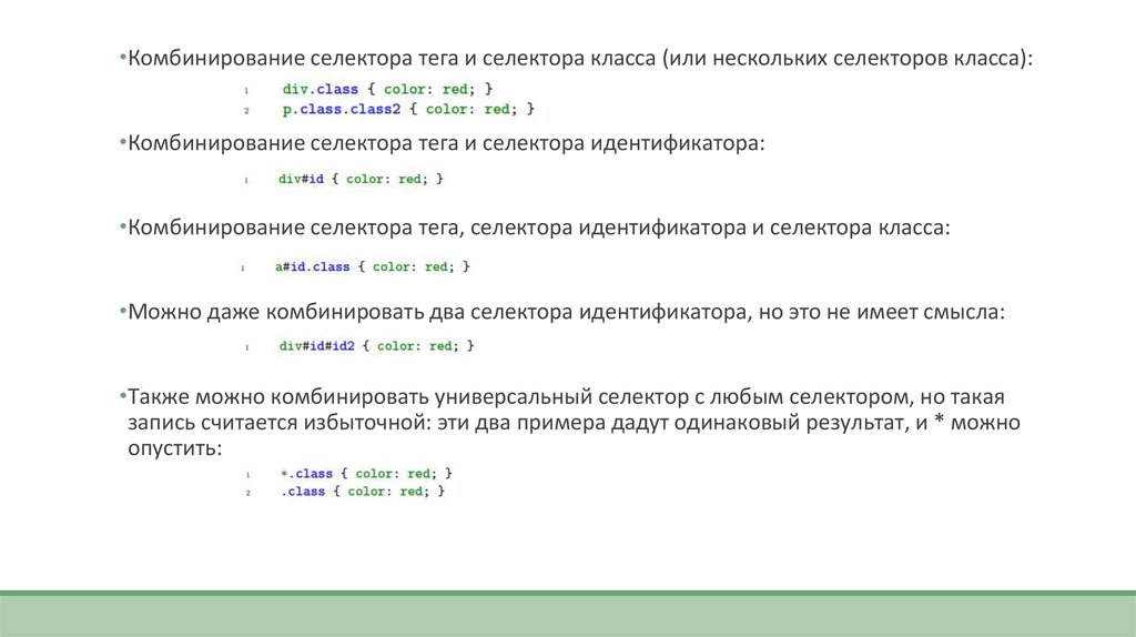 •Комбинирование селектора тега и селектора класса (или нескольких селекторов класса):•Комбинирование селектора тега и селектора идентификатора: