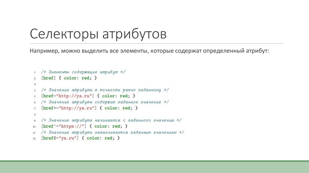 Селекторы атрибутовНапример, можно выделить все элементы, которые содержат определенный атрибут: