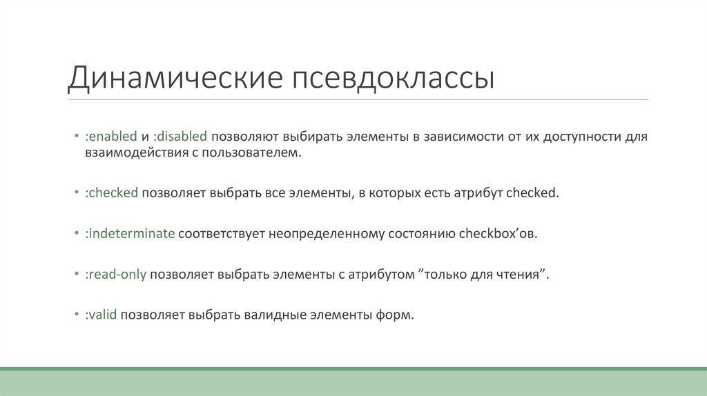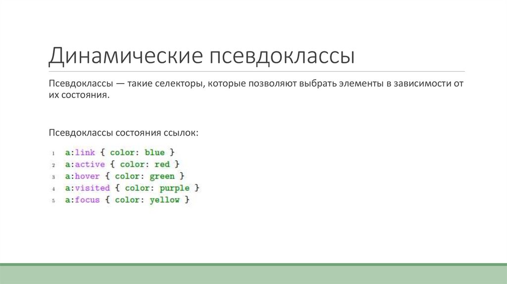 Динамические псевдоклассыПсевдоклассы — такие селекторы, которые позволяют выбрать элементы в зависимости от