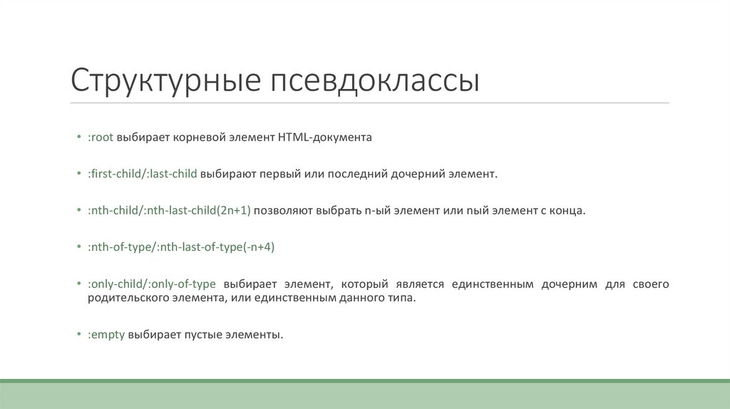 Структурные псевдоклассы• :root выбирает корневой элемент HTML-документа