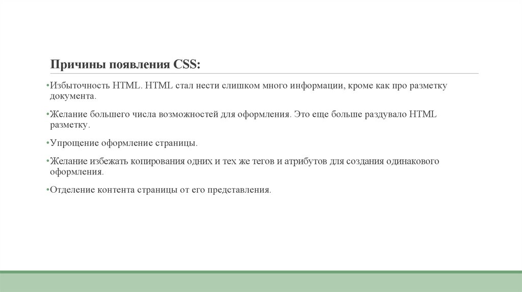 Причины появления CSS:•Избыточность HTML. HTML стал нести слишком много информации, кроме как про разметку
