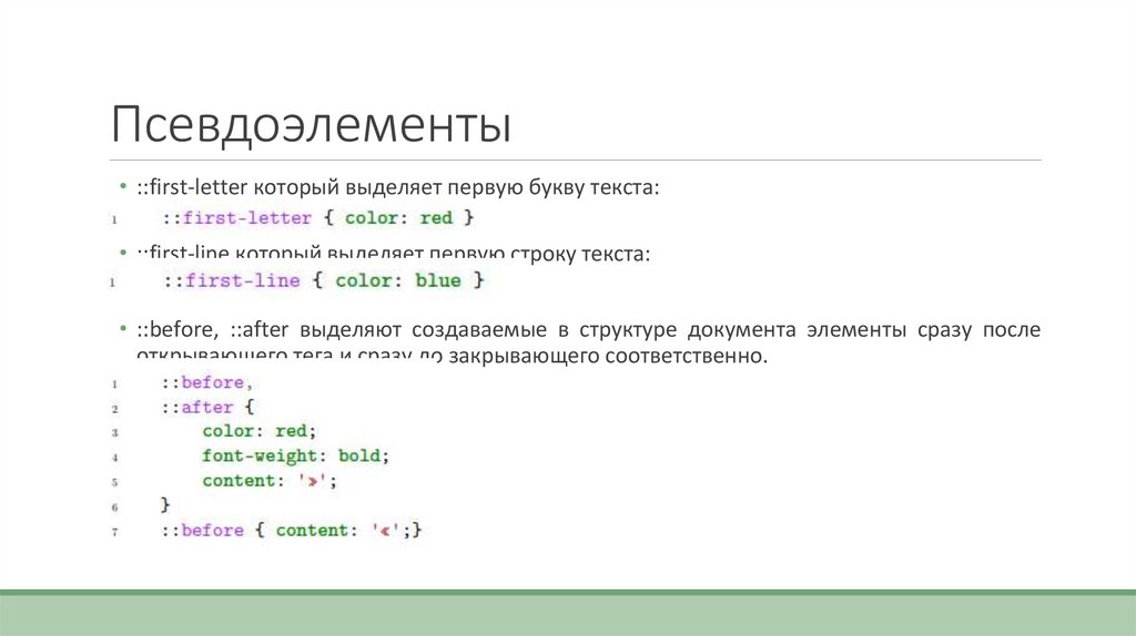 • ::before, ::after выделяют создаваемые в структуре документа элементы сразу после