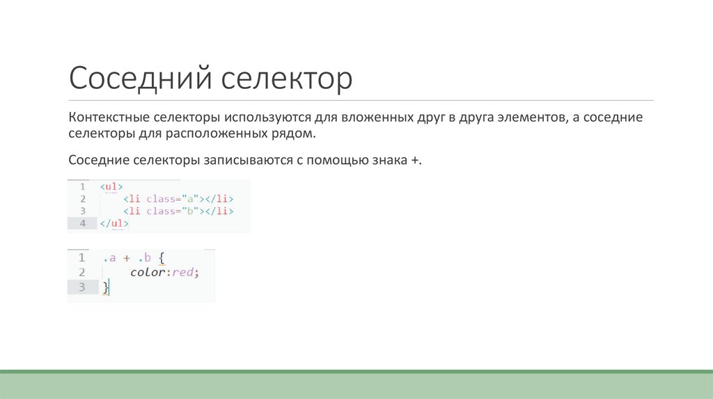 Соседний селекторКонтекстные селекторы используются для вложенных друг в друга элементов, а соседние