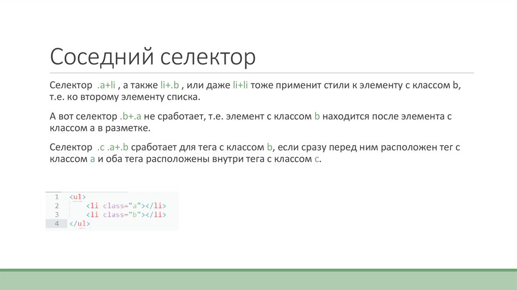 Соседний селекторСелектор .a+li , а также li+.b , или даже li+li тоже применит стили к элементу с классом b,