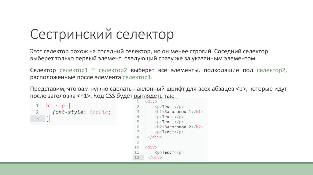 Сестринский селекторЭтот селектор похож на соседний селектор, но он менее строгий. Соседний селектор