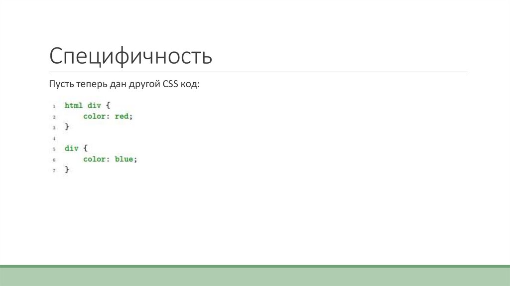 СпецифичностьПусть теперь дан другой CSS код: