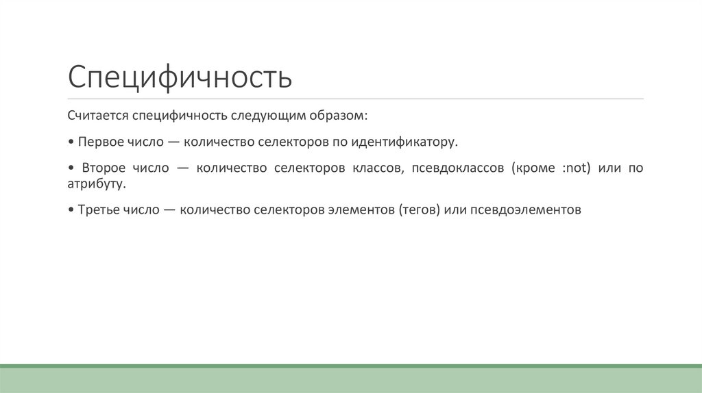 • Второе число — количество селекторов классов, псевдоклассов (кроме :not) или по