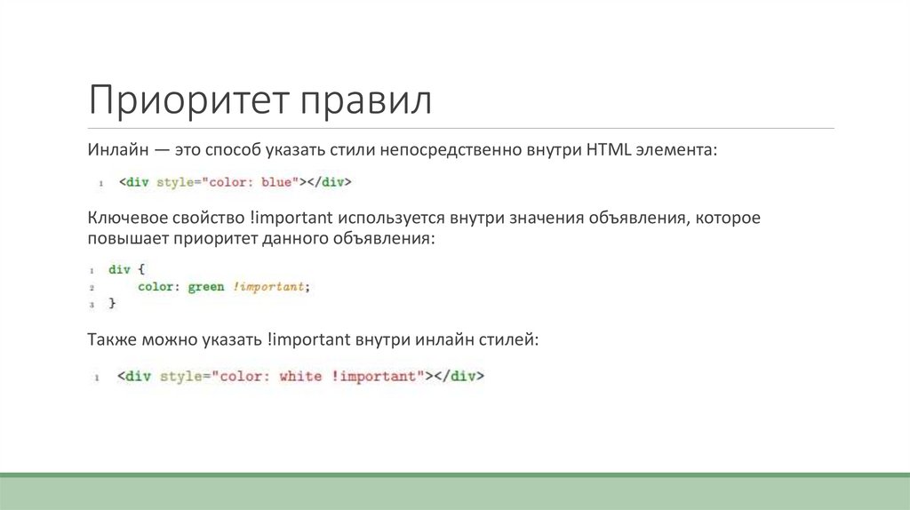 Приоритет правилИнлайн — это способ указать стили непосредственно внутри HTML элемента: