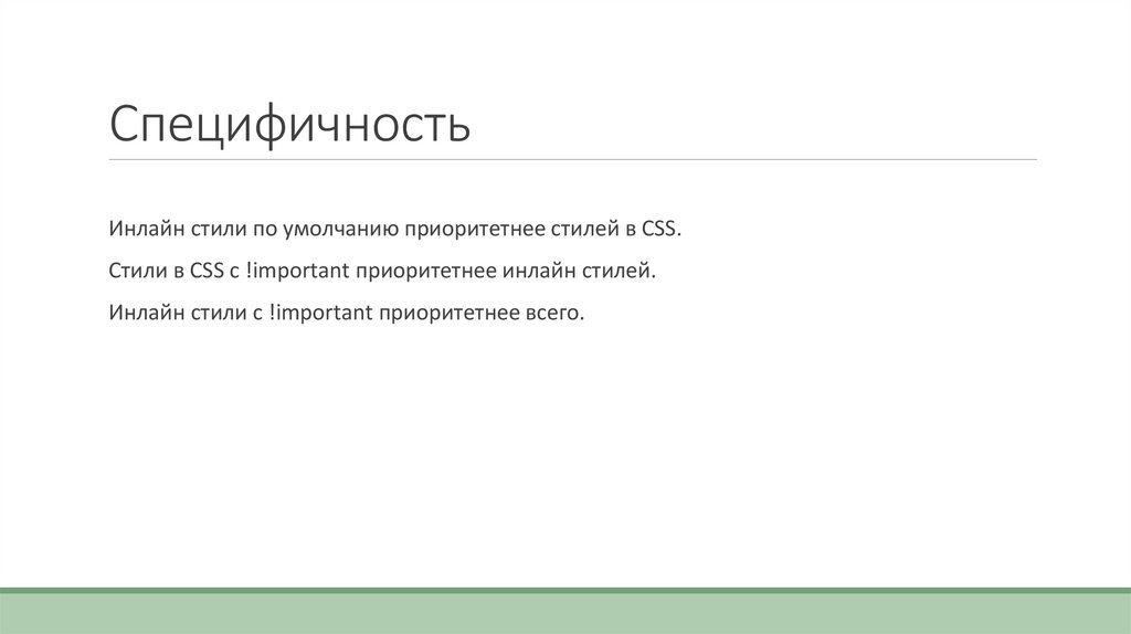 СпецифичностьИнлайн стили по умолчанию приоритетнее стилей в CSS.