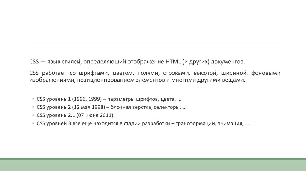 CSS уровень 1 (1996, 1999) – параметры шрифтов, цвета, ...
