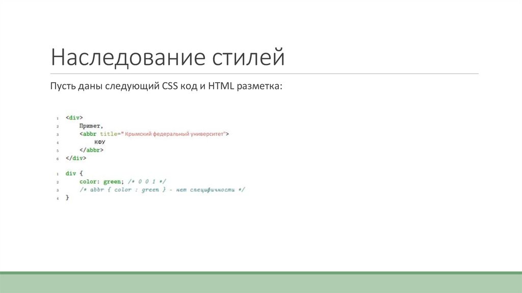 Наследование стилейПусть даны следующий CSS код и HTML разметка: