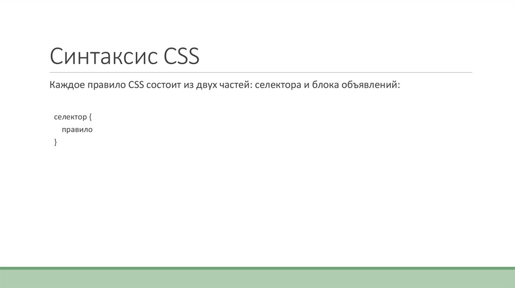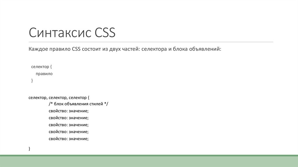 Синтаксис CSSКаждое правило CSS состоит из двух частей: селектора и блока объявлений: