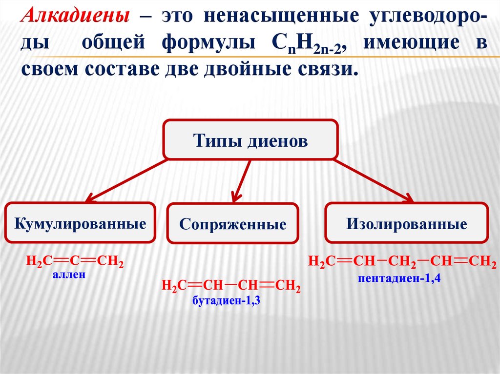 Алкадиены – это ненасыщенные углеводороды общей формулы СnH2n-2, имеющие всвоем составе две двойные связи.