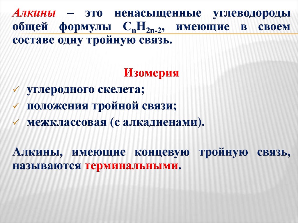 Алкины – это ненасыщенные углеводородыобщей формулы СnH2n-2, имеющие в своем