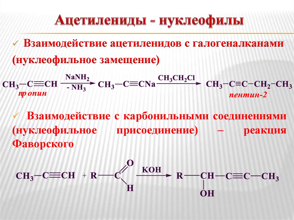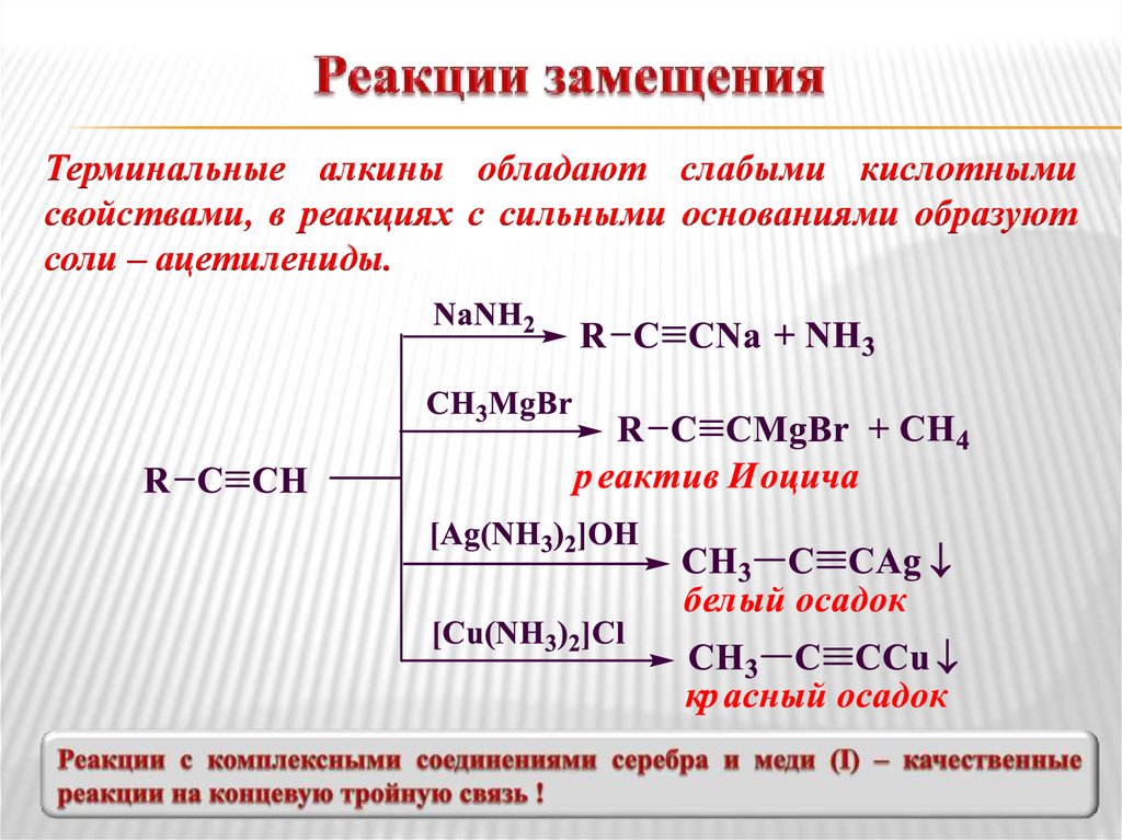 Терминальные алкины обладают слабыми кислотнымисвойствами, в реакциях с сильными основаниями образуют