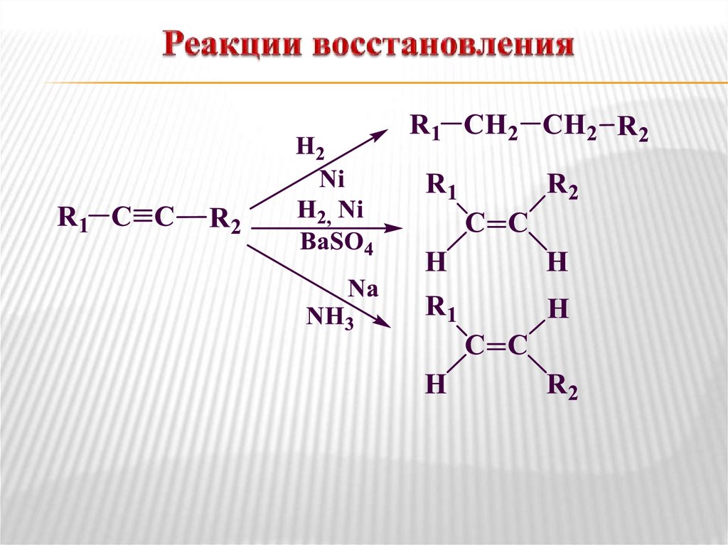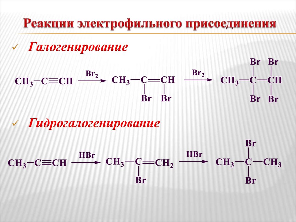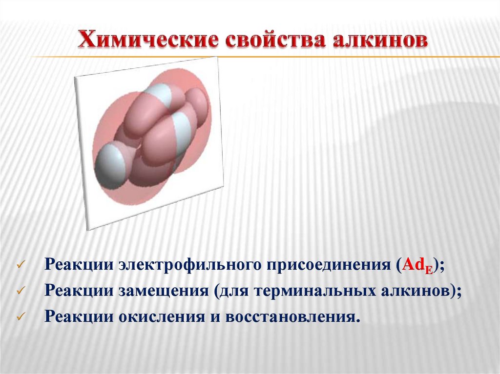 Реакции электрофильного присоединения (AdE);Реакции замещения (для терминальных алкинов);