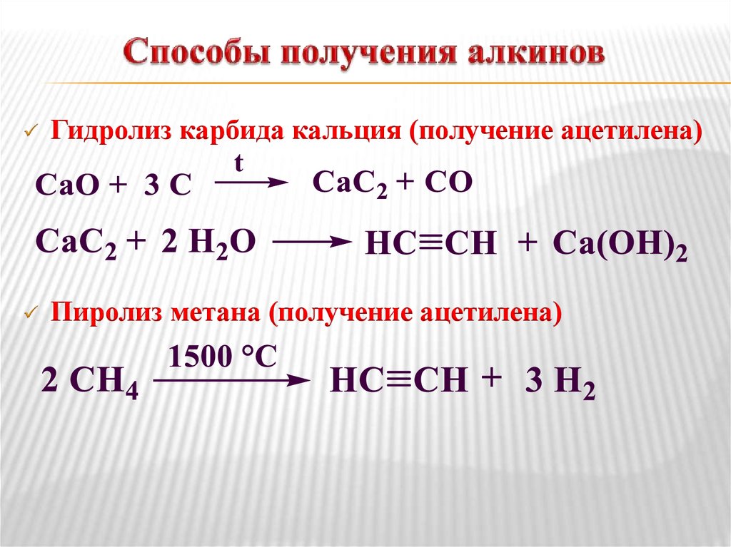 Гидролиз карбида кальция (получение ацетилена)Пиролиз метана (получение ацетилена)