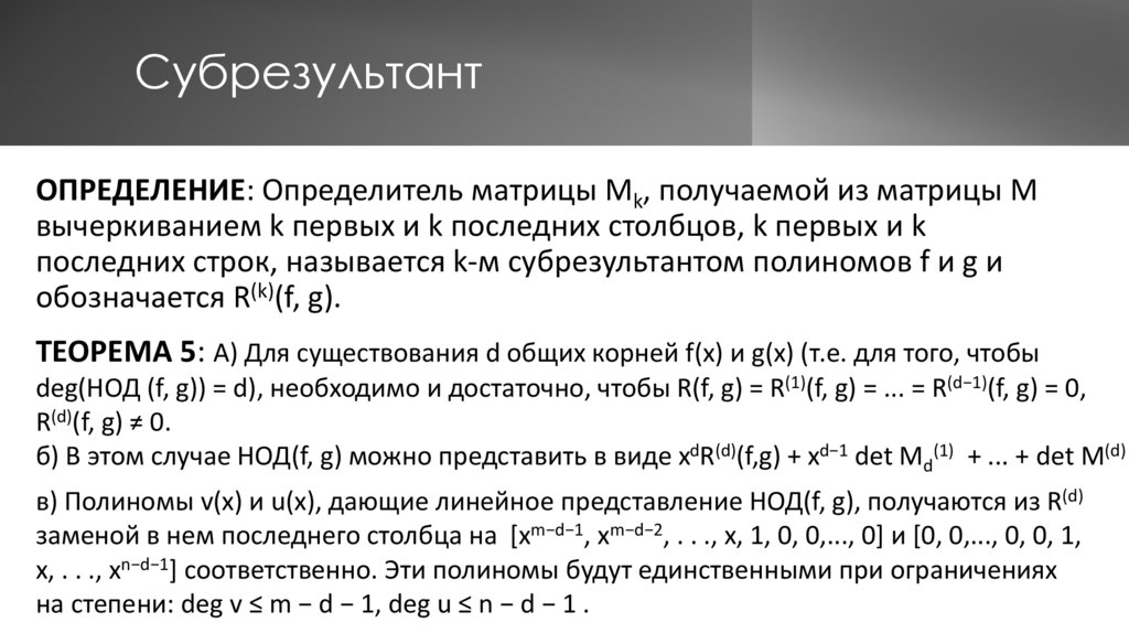 deg(НОД (f, g)) = d), необходимо и достаточно, чтобы R(f, g) = R(1)(f, g) = ... = R(d−1)(f, g) = 0,