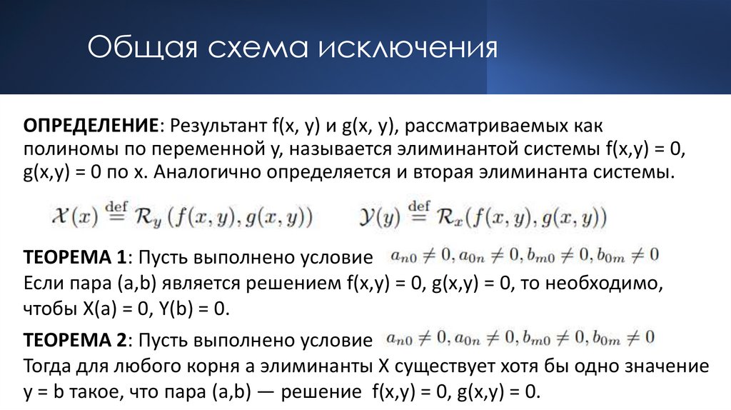 Общая схема исключенияОПРЕДЕЛЕНИЕ: Результант f(x, y) и g(x, y), рассматриваемых как