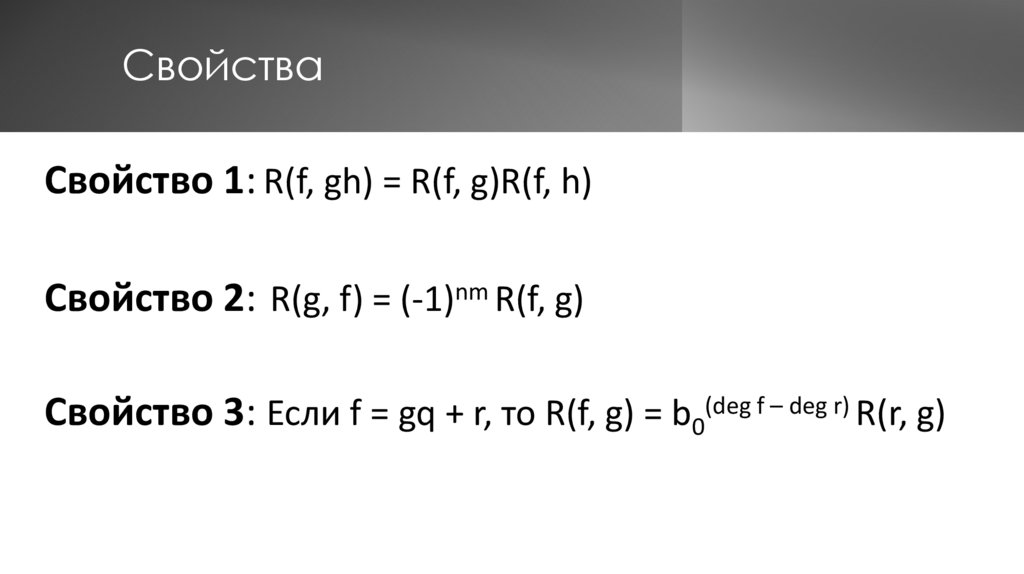 Свойство 3: Если f = gq + r, то R(f, g) = b0(deg f – deg r) R(r, g)