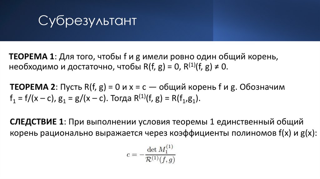 СубрезультантТЕОРЕМА 1: Для того, чтобы f и g имели ровно один общий корень,