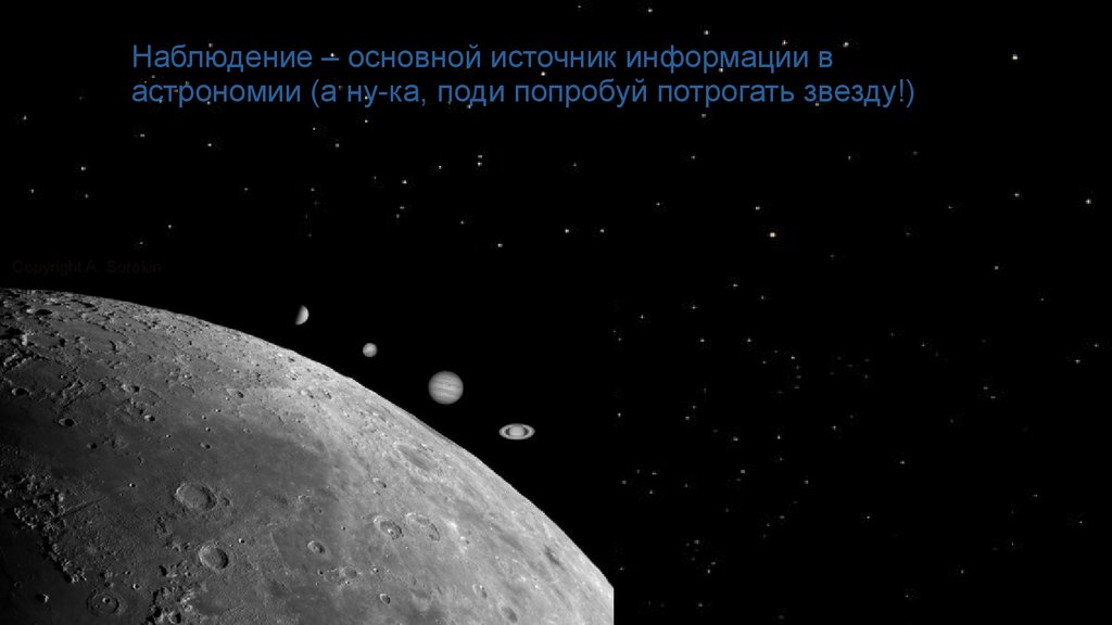 Наблюдение – основной источник информации вастрономии (а ну-ка, поди попробуй потрогать звезду!)