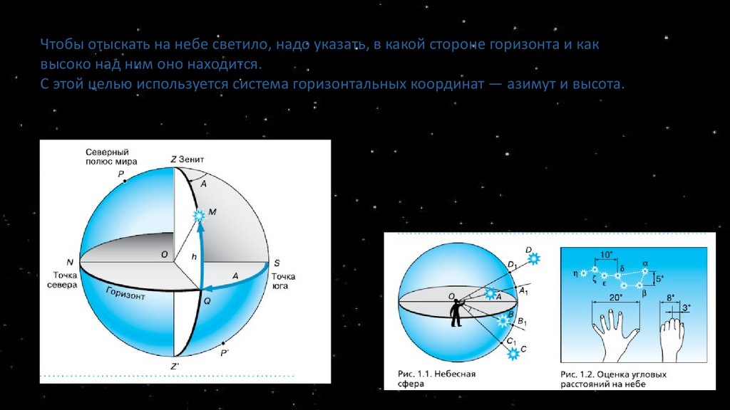 Чтобы отыскать на небе светило, надо указать, в какой стороне горизонта и каквысоко над ним оно находится.