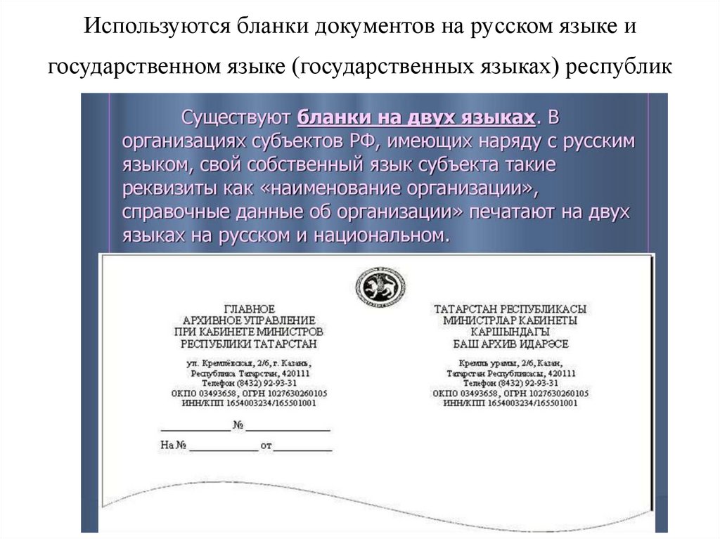 Используются бланки документов на русском языке игосударственном языке (государственных языках) республик
