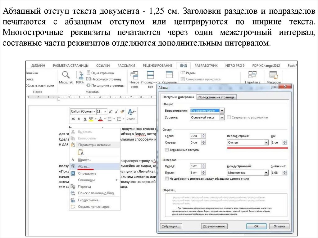 Абзацный отступ текста документа - 1,25 см. Заголовки разделов и подразделовпечатаются с абзацным отступом или центрируются по ширине текста.