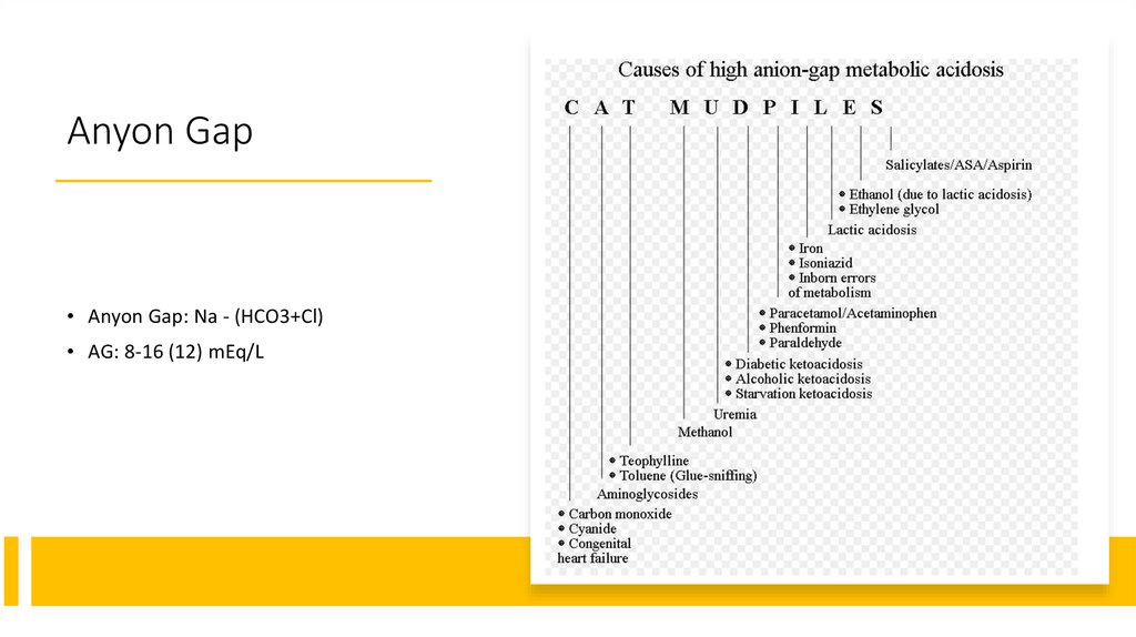 Anyon Gap• Anyon Gap: Na - (HCO3+Cl)