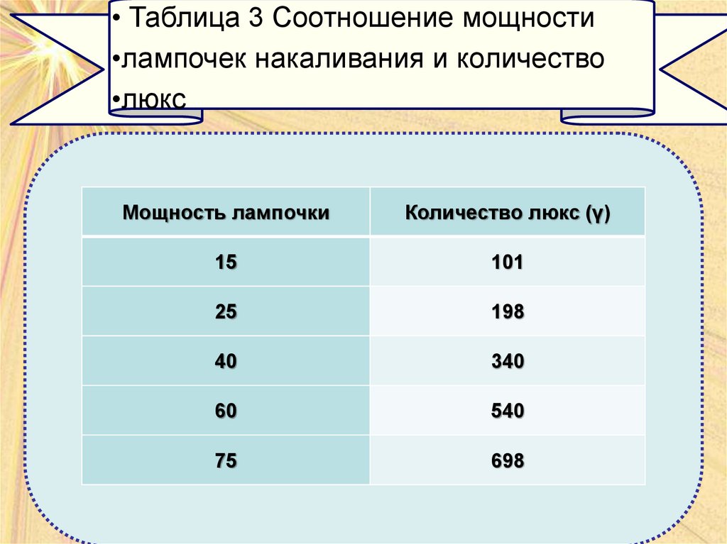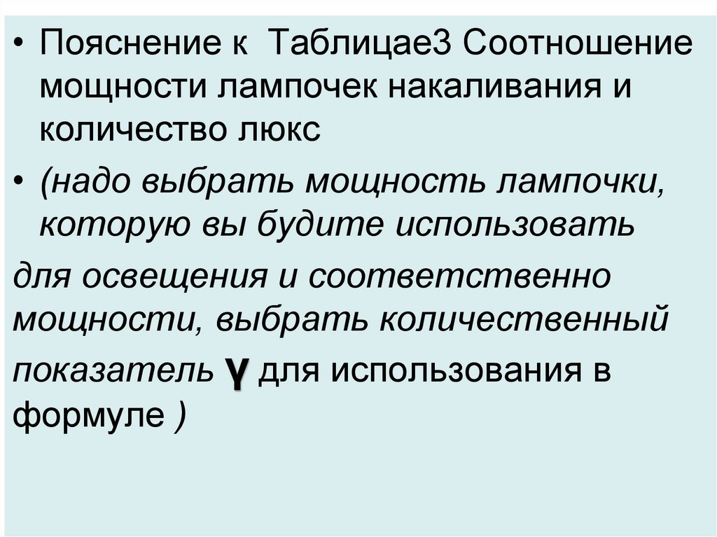 • Пояснение к Таблицае3 Соотношениемощности лампочек накаливания и