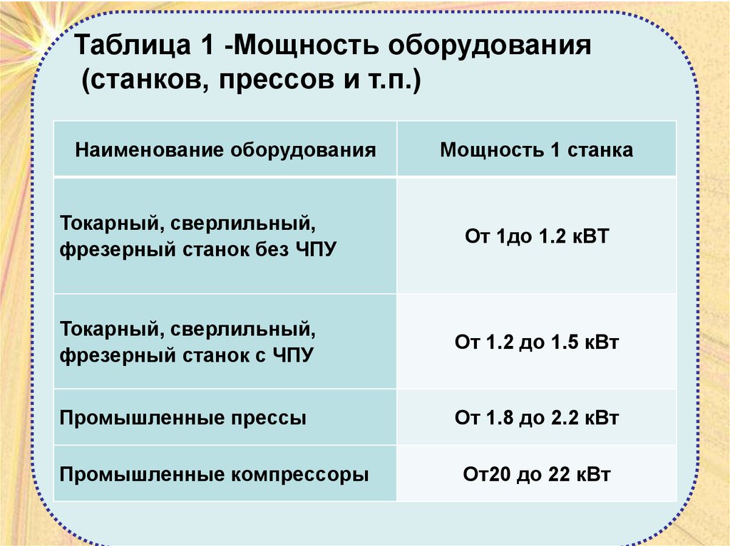 Таблица 1 -Мощность оборудования(станков, прессов и т.п.)