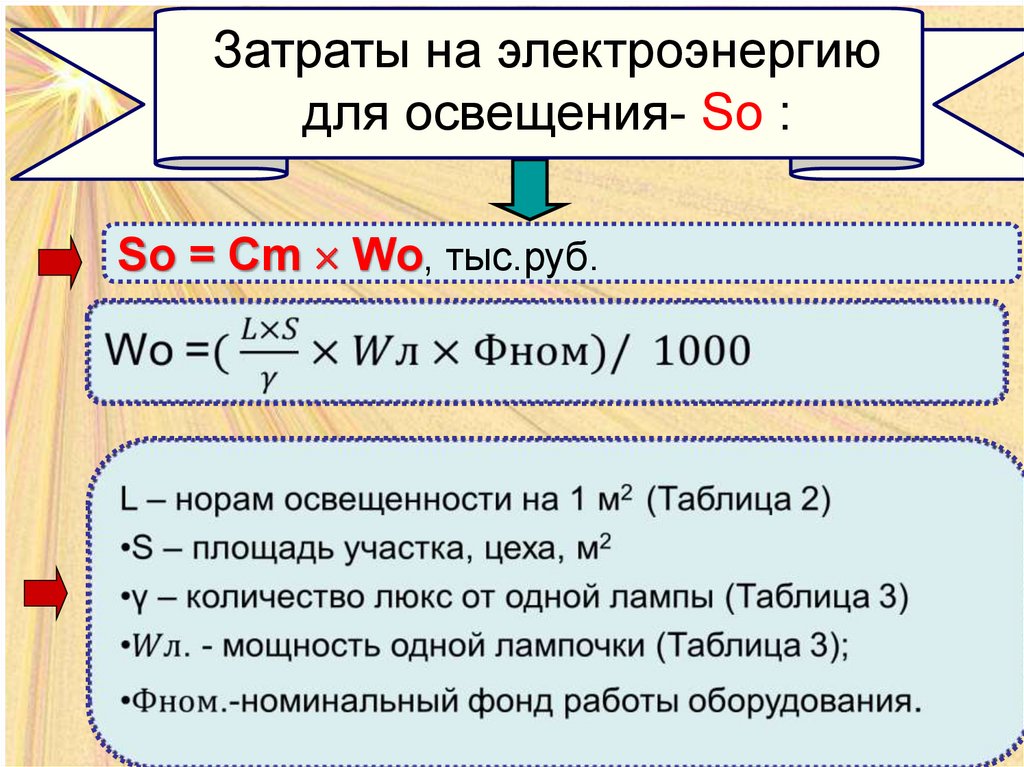 •Sо – затраты электроэнергии для освещения