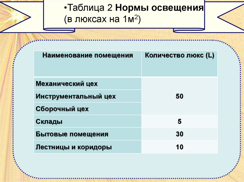 •Таблица 2 Нормы освещения(в люксах на 1м2)