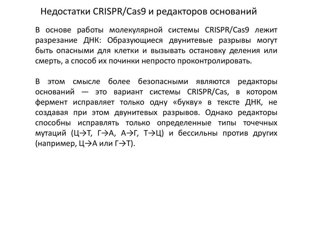 Недостатки CRISPR/Cas9 и редакторов основанийВ основе работы молекулярной системы CRISPR/Cas9 лежит