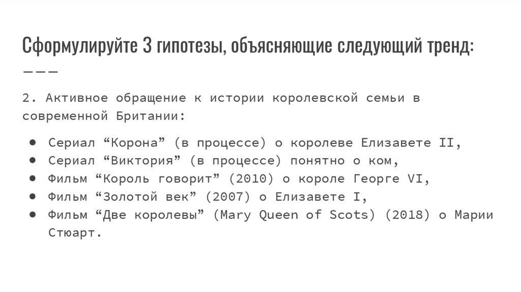 Сформулируйте 3 гипотезы, объясняющие следующий тренд:2. Активное обращение к истории королевской семьи в
